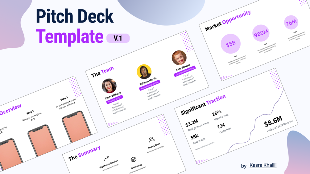 I built this pitch deck from my own experiences of what investors like to see, as well as, taking notes from some prominent accelerator groups like YC and 500 Startups. The goal was to keep the slides as simple as possible while still ensuring that those you share this with can grasp the value of your startup's mission.